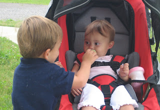 I had taken Ella for a run and she fell asleep in the jogger. When we got home, the only rule that I gave to Ben was "DO NOT WAKE ELLA". He is such a good listener...